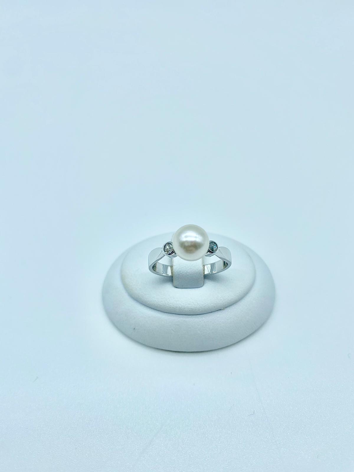 Un elegantissimo anello realizzato a mano in oro bianco, una bellissima perla giapponese e due brillanti di circa 0,10 ct.