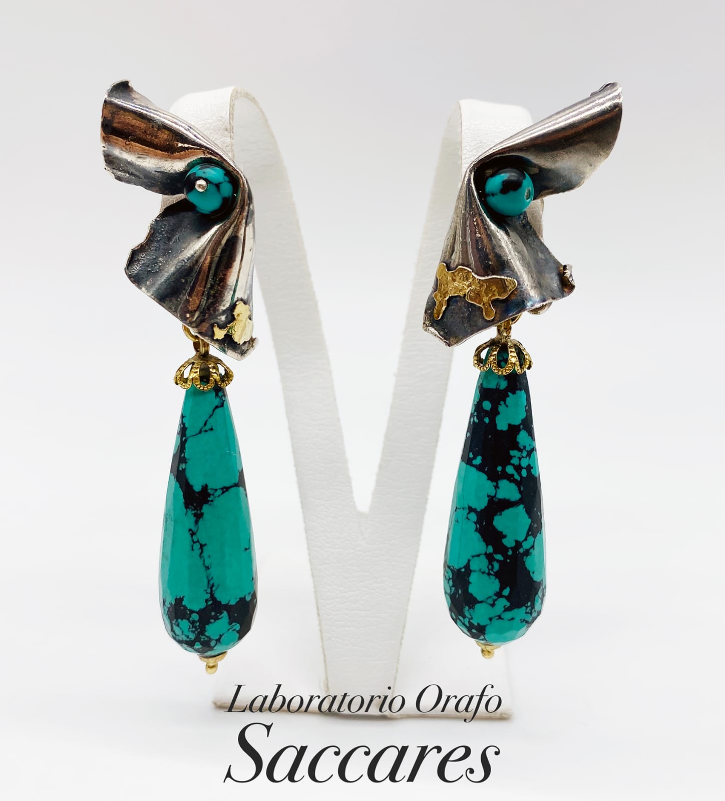 Orecchini realizzati a mano in argento e oro con turchese blu.